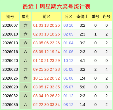本期在星期六进行开奖,根据上方【最近十个星期六奖号统计表】可知,上周六前区奖号为02、22、30、33、34,奇偶比为1:4,最近十个星期六开出的前区奇偶比为26:24,本周六预计奇偶比为2:3。